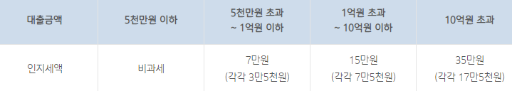 인지세란 인지세법에 의해 대출 약정 시 내는 세금으로 대출금액에 따라 비과세가 산정되며, 은행과 고객이 각각 50%씩 부담합니다.