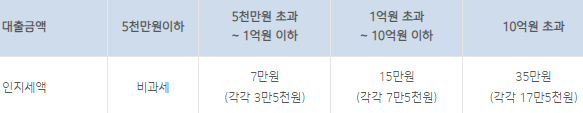 인지세란 인지세법에 따라 대출약정시 납부하는 세금으로 대출금액에 따라 세액이 차등적용되며 은행과 고객이 각각 50%씩 부담하게 됩니다.