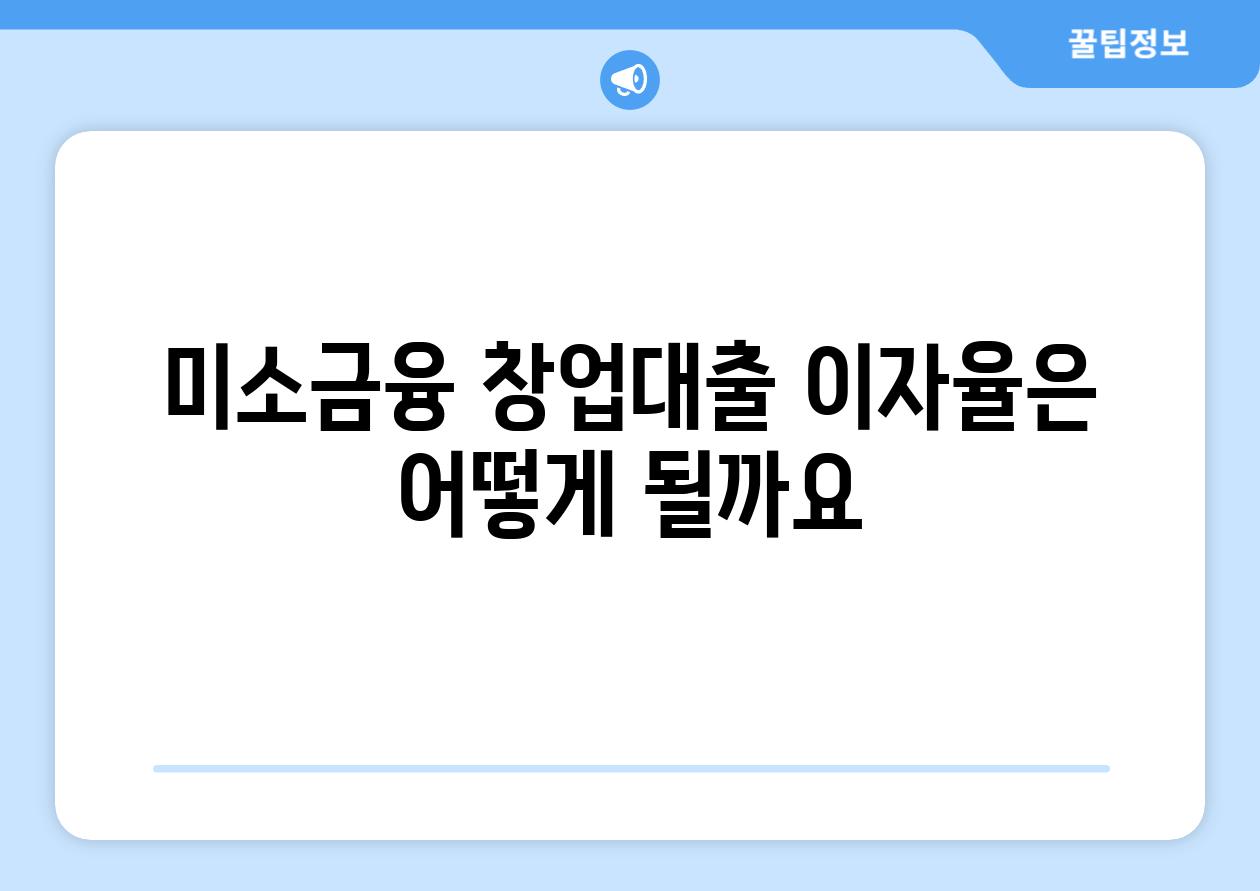 미소금융 창업대출의 이자율은 일반 시중은행 대출보다 낮게 책정되어 있으며, 대출금리는 신용도, 사업 계획, 담보 유무 등을 종합적으로 고려하여 결정됩니다. 따라서 개인의 상황에 따라 차이가 있을 수 있으며, 자세한 내용은 미소금융 기관에 문의하여 확인하는 것이 좋습니다.