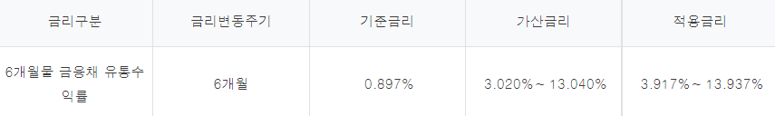 대출금리는 최저 연 3.917% ~ 13.937%까지이며, 기준금리 + 가산금리가 최종 적용금리가 됩니다.